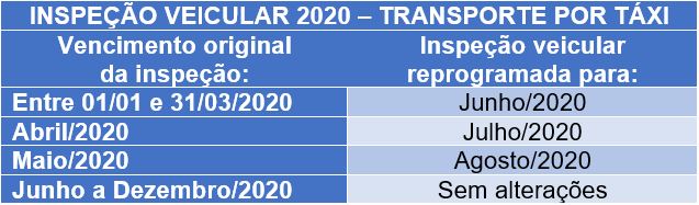 No caso do transporte individual de passageiros por táxi, os veículos que passaram pela inspeção veicular neste ano (entre 1º de janeiro e 19 de março) estão dispensados de realizar nova inspeção em 2020.