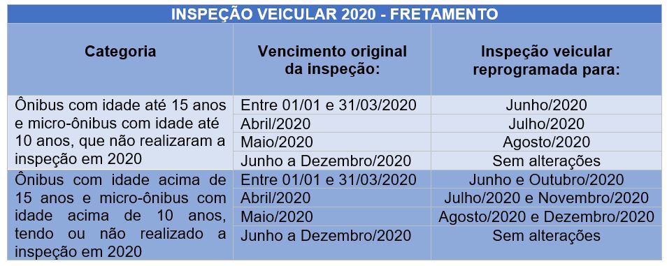 Pelo novo calendário, os ônibus que possuem idade até 15 anos de fabricação e os micro-ônibus com idade até 10 anos, que realizaram inspeção mecânica até o dia 19 de março deste ano, estão dispensados de realizar novo procedimento em 2020. O calendário será retomado normalmente em 2021.
