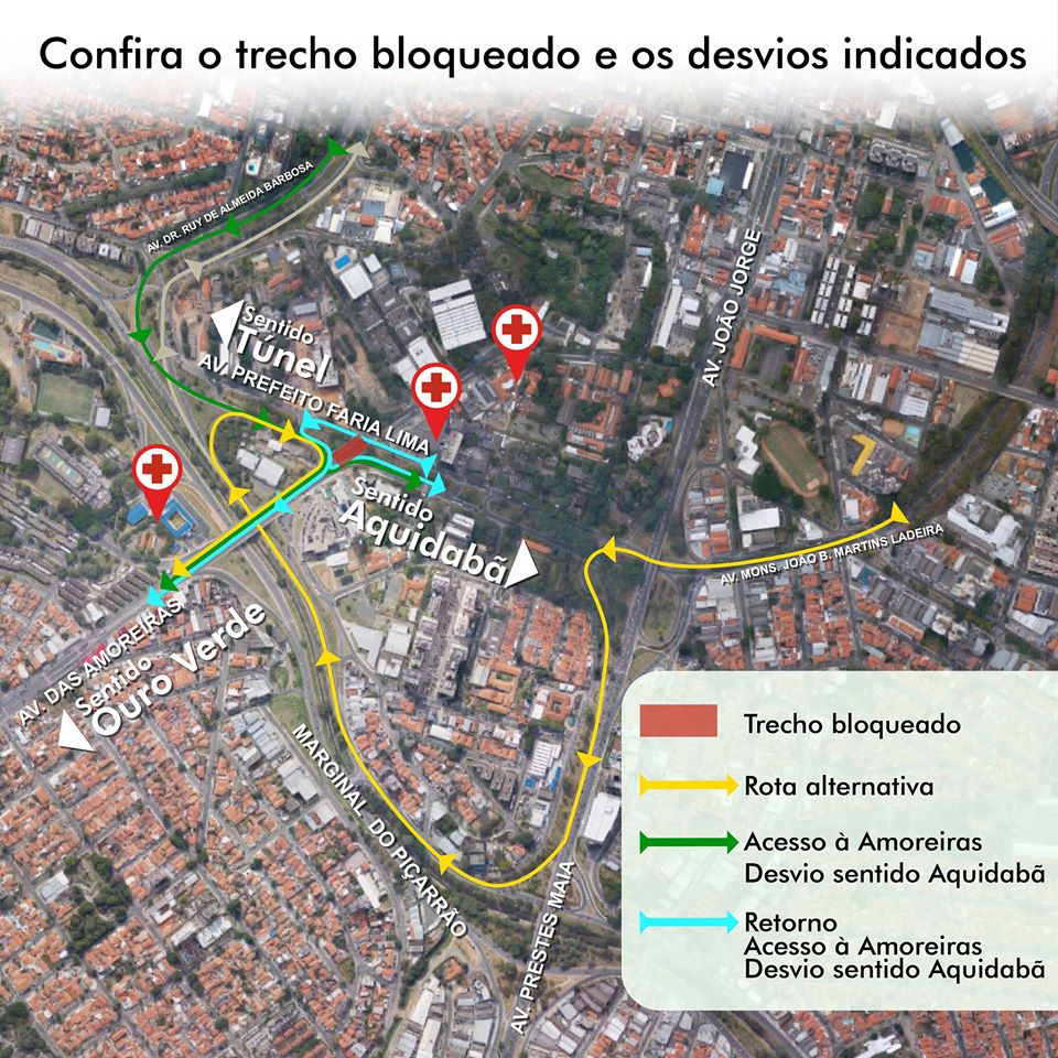 O tráfego de veículos será parcialmente interditado no cruzamento das avenidas Amoreiras e Prefeito Faria Lima, impossibilitando a conversão. Apenas uma faixa de rolamento da Avenida Prefeito Faria Lima estará liberada ao tráfego, em ambos os sentidos.