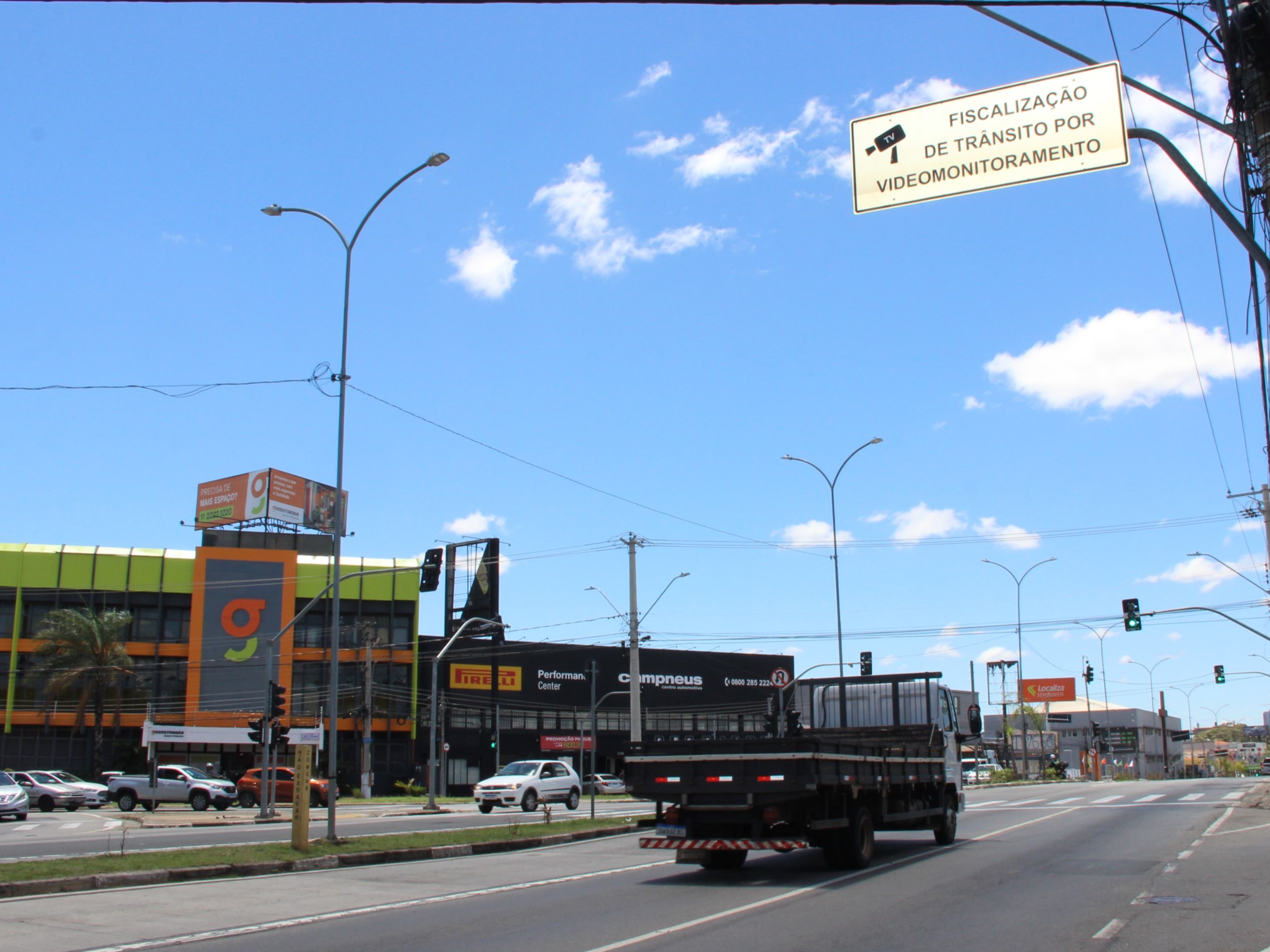 Placas (sinalização vertical) foram instaladas nas aproximações para alertar os condutores sobre a presença da câmera: “Fiscalização de trânsito por câmeras de monitoramento”.