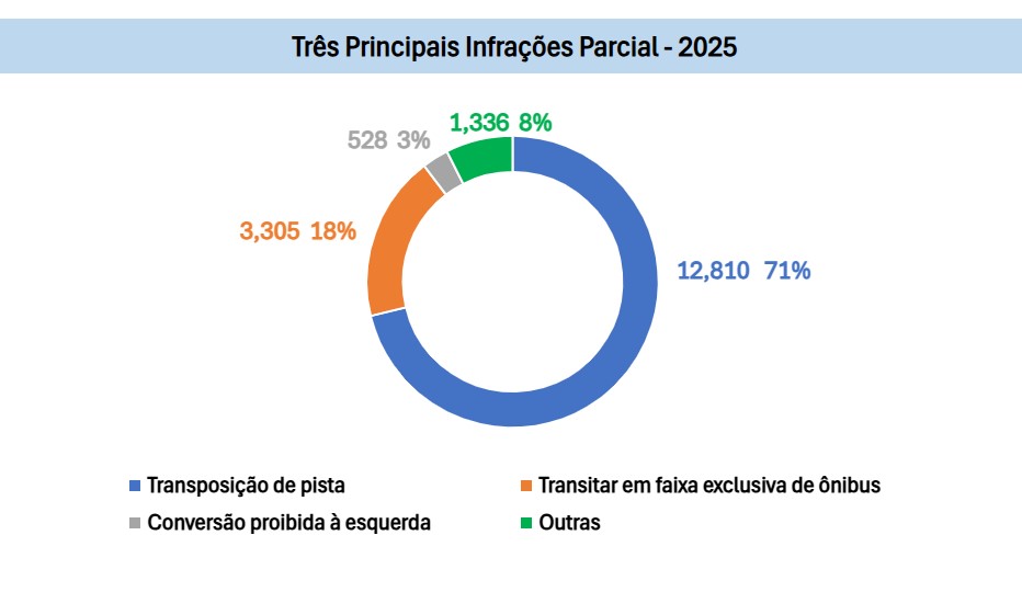 Os 13 pontos de fiscalização remota registraram, entre janeiro e novembro de 2025, 17,9 mil infrações de trânsito. A conduta de risco que mais aparece, com 12,8 mil autuações, é a transposição de pista, situação recorrente no cruzamento da avenida Dr. Moraes Salles com a rua Irmã Serafina. Circular indevidamente em faixa exclusiva para o transporte público aparece em segundo lugar, com mais de 3,3 mil situações identificadas.