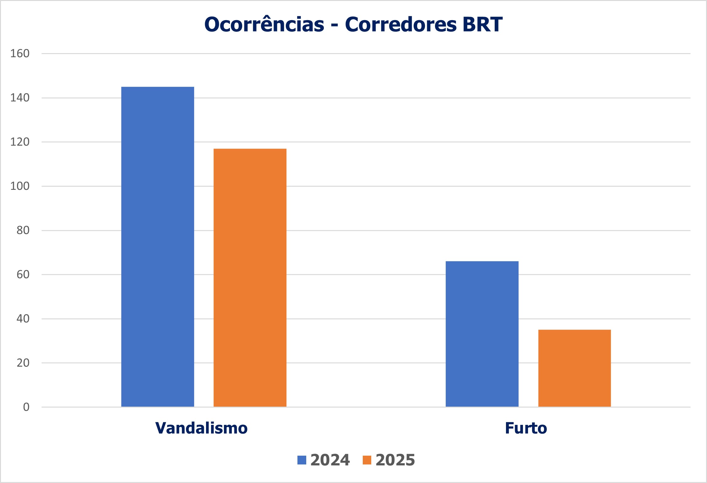 Foram 66 ocorrências de furtos registradas em 2024 e 35 em 2025. Já o balanço de atos de vandalismo indica 145 ocorrências em 2024 e 117 em 2025. A somatória das ocorrências aponta 211 casos em 2024 e 152 em 2025 – queda geral de quase 28%.