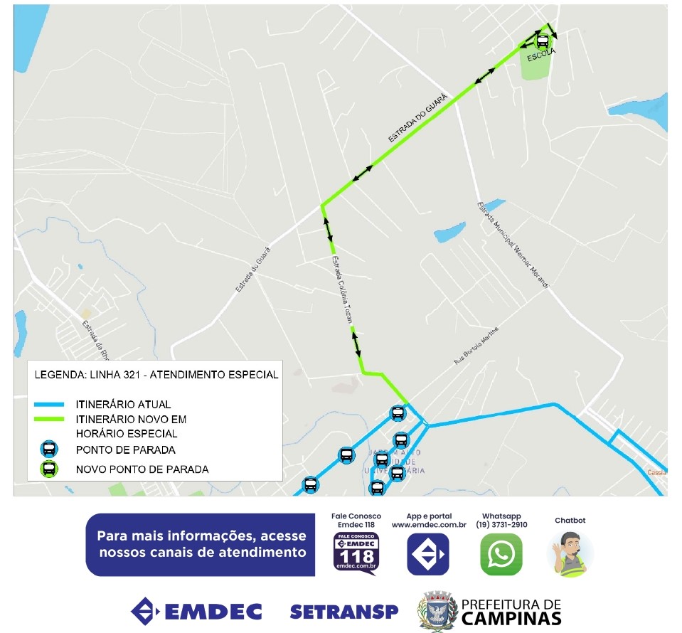 Para garantir oferta de transporte aos alunos da Escola Estadual “Professora Dora Maria Maciel de Castro Kanso”, localizada no Village Campinas, as linhas 321 (Centro Médico / Terminal Barão Geraldo) e 322 (Village Campinas / Terminal Barão Geraldo) vão circular com trajetos especiais, em dias úteis, a partir do dia 2 de fevereiro.