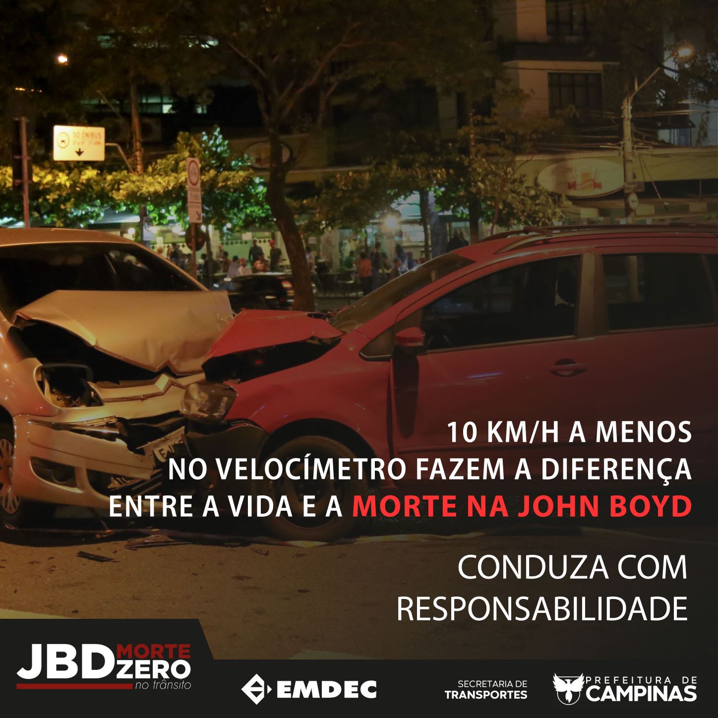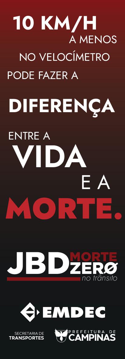 Lançada em Campinas em 25 de fevereiro de 2022, a campanha de segurança viária JBD: Morte Zero no Trânsito tem o objetivo de zerar os acidentes com vítimas fatais na Avenida John Boyd Dunlop (JBD), sobretudo conscientizando a população sobre o excesso de velocidade praticado na via. A iniciativa da Emdec e Secretaria Municipal de Transportes (Setransp) também foca no respeito à sinalização e em repensar comportamentos, ecoando a Campanha 3Rs (respeite, repense, reduza).