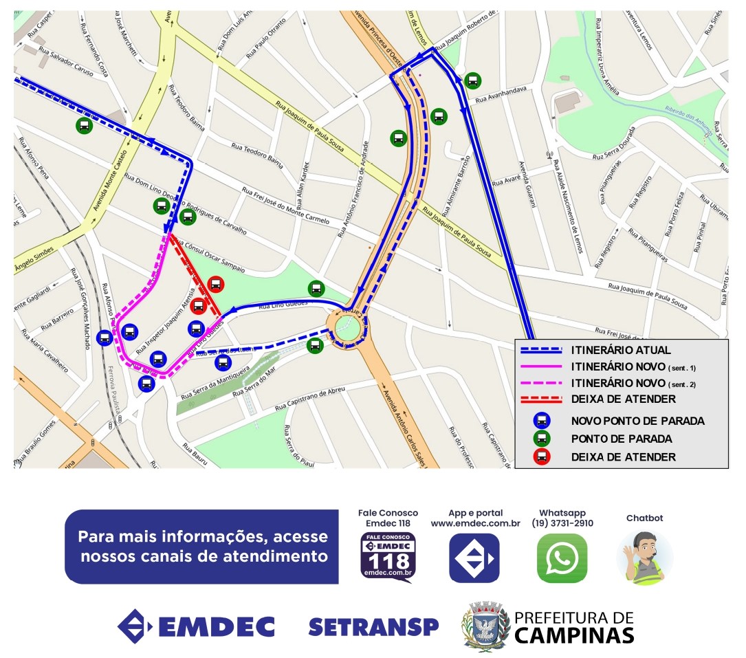 No sentido Castelo, ela vai circular e atender novos pontos de parada nas ruas Lino Guedes, Bauru e Afonso Pena, retomando o trajeto pela Dom Luiz Antônio de Souza. No sentido Jardim Proença, atenderá pontos na Afonso Pena, Bauru e Serra dos Itatins. Deixa, portanto, de atender aos pontos da rua Rosa Lopes.